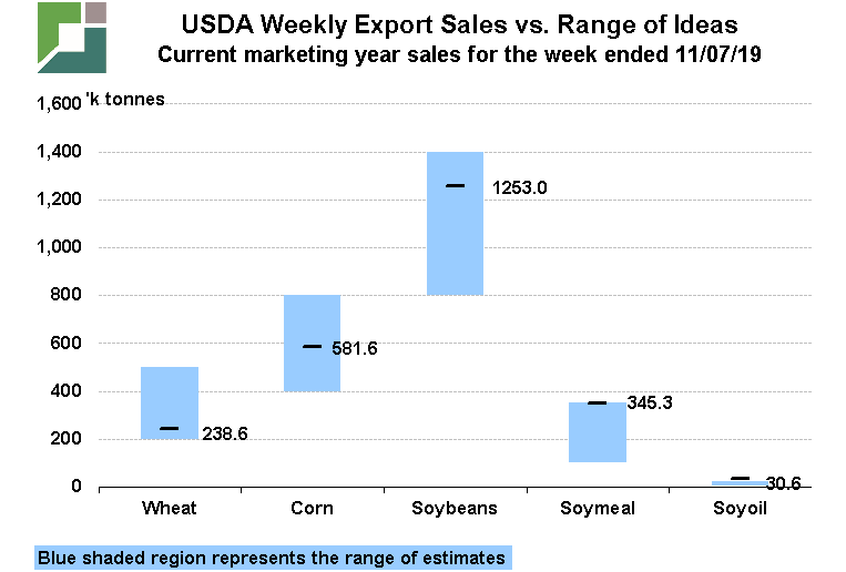 U.S. soybean meal sales last week were strong at 345k tonnes, at the top of market expectations of 100-350k tonnes, up from the previous week’s 262k tonnes and were the 2nd largest of the first six weeks of 2019/20. Total commitments of 4.513 MMT are down 14% from last year, though, as the year-over-year deficit has actually increased since the start of the marketing year as SBM sales have averaged 236k tonnes/week so far vs last year’s 277k tonnes/week during the same period. The USDA is estimating 2019/20 SBM exports to decline 1.5% from last year. Soybean oil sales of 31k tonnes were slightly above the range of market ideas of 5-25k tonnes and were the best of the first six weeks of 2019/20. Total commitments are up 2% from last year vs the USDA’s export projection reflecting an expected 12% decline in exports on the year.