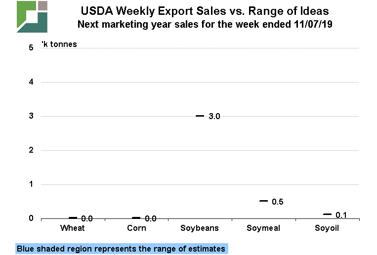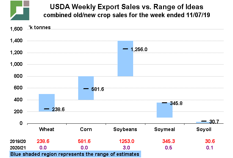 U.S. soybean sales, for the week ended 11/07/19, were solid at 1.253 MMT (46.0 million bushels), down from the previous week’s 64.3 million bushels, but still good overall and within market expectations of 800k-1.4 MMT. This week’s activity included 625k tonnes in new sales reported for China specifically and at least 425k tonnes in new net sales to unknown destinations. While it remains encouraging to see the new sales to China, it’s hard to ignore the fact that only 203k tonnes in total sales this week were reported to destinations other than China and unknown. Sales on the books to China now total 7.91 MMT vs just 646k tonnes at this time last year, while outstanding “unknown” sales of 3.21 MMT are solidly below last year’s 5.52 MMT at this time. Total commitments to all destinations of 818 million bushels are up marginally from last year’s 804 million, but when does the fact that total sales to all other destinations than China of 528 million bushels are down massively from last year’s 780 million (-32%) begin to gain some attention? Soybean sales will need to average roughly 23.1 million bushels/week in order to reach the USDA’s 1.775 billion bushel export projection vs last year’s 23.5 million/week average from this point forward.