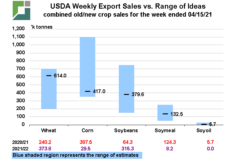 U.S. soybean sales, for the week ended 4/15/21, were minimal at 64k tonnes (2.4 million bushels), but were within market expectations of -100k to +250k tonnes while continuing the string of minimal sales over the last five weeks in particular, averaging a mere 1.4 million bushels/week during the period. Over the last nine weeks, a total of 38.3 million bushels of old crop soybeans have been sold (4.3 million/week average), aided by a single-week sale of 12.9 million bushels. This week’s activity again included net cancellations by China of 51k tonnes, bringing their outstanding (unshipped) sales on the books down to 714k tonnes, but could still be 1.2-1.3 MMT taking into account sales to unknown. More importantly, recent sales activity has actually fallen below levels we estimate may be needed in order to reach the USDA’s 2.280 billion bushel export estimate. Based on estimated carry-over sales to next year and the difference between official Census Bureau exports and Export Sales data, we see soybean sales needing to average roughly 4.0 million bushels/week through the end of the marketing year as total commitments are still “only” at 2.235 billion bushels vs teh 1.4 million/week average over the last five weeks. New crop sales of 315k tonnes (11.6 mil bu) were within expectations of 250-500k tonnes (130k unknown/130k Pakistan/none China) and brings 2021/22 total commitments to 228 mil bu vs 35 million in new crop sales at this time last year.