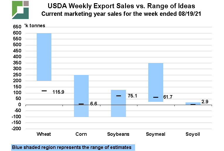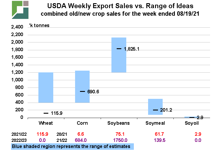 U.S. corn sales, for the week ended 8/19/21, were uneventful with old crop sales a mere 7k tonnes (0.3 million bushels) vs expectations of -100k to +250k tonnes, while new crop sales of 684k tonnes (26.9 mil bu) were within expectations of 500k-1.0 MMT. Old crop activity featured net cancellations by China of 135k tonnes, leaving them with roughly 1.5 MMT (59 mil bu) in unshipped old crop sales still on the books with 12 days remaining in the 2020/21 marketing year. In total, 163 million bushels of outstanding (unshipped) old crop sales remain on the books vs 92 million bushels at this time last year. Based on recent shipment and sales activity, we feel old crop exports could prove around 25 million bushels below the USDA’s current 2.775 billion bushel projection. New crop sales were dominated by Mexico with 492k tonnes, while there was no new activity by China for the week. 2021/22 total commitments of 759 million bushels remain well above last year’s 527 million thanks to the aggressive earlier purchases by China of 10.7 MMT.