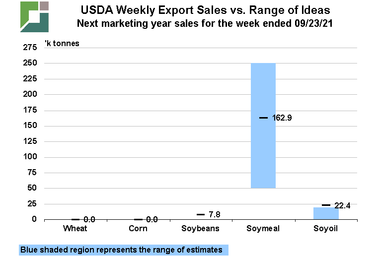 Soybean meal sales were within expectations with old crop sales at 67k tonnes (0-100k expected) and new crop sales at 163k tonnes (50-250k tonnes expected) with the 2020/21 marketing year nearing its end with only one full week of data now remaining. 2020/21 total commitments are up nearly 2% from last year vs USDA estimating exports unchanged so it will simply come down to the actual pace of shipments during September in how final exports play out relative to the USDA’s projection, while new crop commitments of 2.528 MMT are now below last year’s 2.886 MMT after consistently running better than year ago levels for months. Soybean oil sales remain minimal with 6k tonnes in old crop sales (-5k to +10k expected), while some new crop sales finally showed up with 22k tonnes sold last week vs 0-20k expected. Despite the largest new crop sales so far, total sales for 2021/22 are still only at 30k tonnes vs 123k tonnes in new crop sales at this time last year. Old crop total commitments are down nearly 46% from last year with one week remaining vs USDA estimating 2020/21 exports to be down nearly 40% on the year.