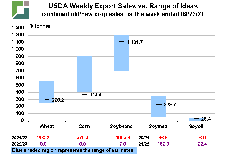 U.S. corn sales, for week ended 9/23/21, were only 370k tonnes (14.6 million bushels), below market expectations of 400-900k tonnes, little-changed from the previous week’s 14.7 million bushels and massively below last year’s same-week sales of 79.8 million bushels. Even more discouraging is the fact total commitments for 2021/22 of 997 million bushels are now up less than 3% last year’s 969 million after previously running at a record pace and significantly above year ago levels ahead of the start of the new marketing year. It is almost certain commitments will fall below year ago levels in the coming weeks as corn sales over the next five weeks last year averaged nearly 68 million bushels/week, while sales over the last three weeks have averaged only 13.0 million bushels/week. The largest sales this week went to Guatemala with 138k tonnes. Based on the USDA’s 2.475 billion bushel export projection we estimate corn sales will need to average roughly 30 million bushels/week over the remainder of the marketing year vs last year’s 37 million bushel/week average from this point forward.