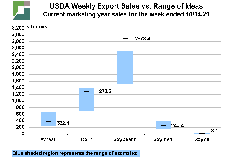 U.S. corn sales, for the week ended 10/14/21, were 1.273 MMT (50.1 million bushels), towards the upper end of market expectations of 700k-1.4 MMT, up from the previous week’s 40.9 million and were the best of the 2021/22 marketing year so far just outpacing sales two weeks prior of 49.9 million bushels. However, this week’s sales were still considerably below last year’s 72.1 million bushels this week, prompting total commitments of 1.138 billion bushels to fall to only 2.0% above year ago levels and are likely to slip below last year over the next two weeks with sales a year ago in the coming weeks of 88 million and 103 million bushels. The largest sales of the week went to unknown destinations of around 630k tonnes, while activity by China was negligible. The largest reported sales were to Mexico of 416k tonnes. In order to reach the USDA’s 2.500 billion bushel export projection, we estimate corn sales will need to average roughly 29.2 million bushels/week over the remainder of the marketing year vs last year’s 36.5 million/week average from this point forward and the most-recent 5-year average of 31.7 million/week.