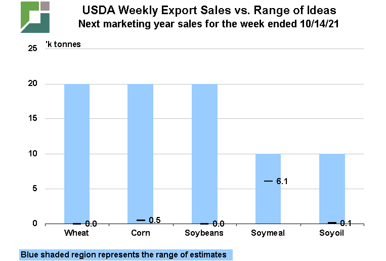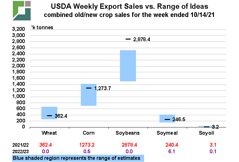 U.S. soybean meal sales were solid at 240k tonnes, within expectations of 150-400k tonnes, but easily beating the roughly 161k tonnes/week average “needed” sales pace and followed the previous week’s also-strong 365k tonnes. Total commitments, now two weeks into 2021/22 are up 9% from last year vs USDA estimating exports this year to be up 2% from 2020/21. Soybean oil sales remain miniscule with only 3.0k tonnes sold for the week vs market expectations of 4-25k tonnes and paled in comparison to last year’s sales this week of 37k tonnes. Total commitments of 108k tonnes are now down 50% from last year’s 215k tonnes, leaving sales needing to average roughly 7.5k tonnes/week vs last year’s 9.5k/week average in order to reach the USDA’s 1.250 billion pound export projection – reflecting an expected 27% decline in exports on the year.
