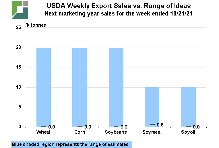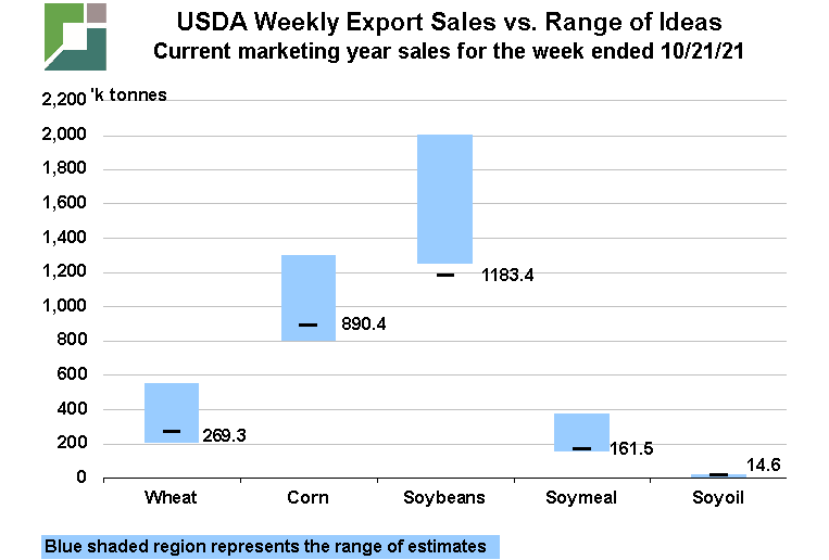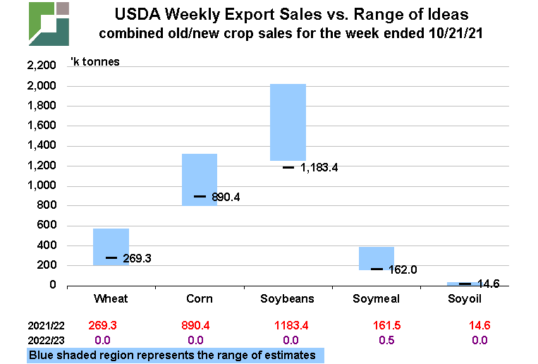 U.S. corn sales, for the week ended 10/21/21, of 890k tonnes (35.1 million bushels) were at the bottom end of market expectations of 800k-1.3 MMT, down from the previous week’s 50.1 million bushels, a 4-week low and significantly below last year’s same-week sales of 88.3 million. Accordingly, total commitments of 1.173 billion bushels slipped below year ago levels for the first time of the marketing year, now down 2.6% from last year’s 1.204 billion in a continuation of the dramatic reversal of what previously had been a record early sales pace for corn amid the massive Chinese purchases in May. Over a span of three weeks, China bought 10.7 MMT of U.S. corn in May, prompting new crop total sales to soar to a record 593 million bushels at the time. Since then, Chinese buying has been nearly non-existent with total commitments now standing at 11.9 MMT, reflecting total purchases of only 1.2 MMT since May. This week’s activity included minor net cancellations by China of 1k tonnes. We would also note, total sales currently on the books to all other destinations besides China of 17.9 MMT are below last year’s 20.0 MMT at this time. Based on the USDA’s 2.500 billion bushel export projection, we estimate corn sales will need to average roughly 29.0 million bushels/week over the remainder of the marketing year vs last year’s 35.3 million/week average from this point forward.