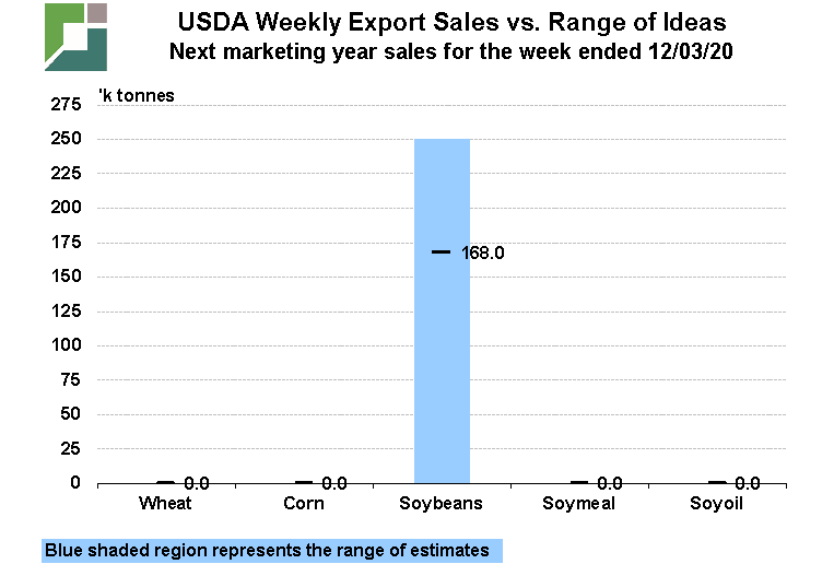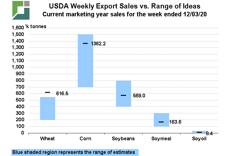 U.S. soybean sales, for the week ended 12/03/20, were 569k tonnes (20.9 million bushels), which were within market expectations of 400-800k tonnes, but certainly continuing to reflect the slowing of sales activity in recent weeks. After the extremely strong start to this year’s sales program, in which sales averaged 85.2 million bushels/week over the first 10 weeks of 2020/21 vs 50.9 mil bu/week last year, sales over the last four weeks slowed to 27.6 mil bu/week on average, which have been well below last year’s 44.6 mil bu/week average during the same period. This week’s activity included new net sales to China of only 233k tonnes (459k tonnes previously announced as unknown were switched to China), with their total commitments now at 30.4 MMT vs 9.8 MMT last year. Total commitments to all destinations of 1.944 billion bushels compare to 992 million last year, leaving sales needing to average only about 7.2 million bushels/week for the rest of the marketing year in order to reach the USDA’s 2.200 billion bushel export projection vs last year’s 19.8 mil/week average from this point forward.