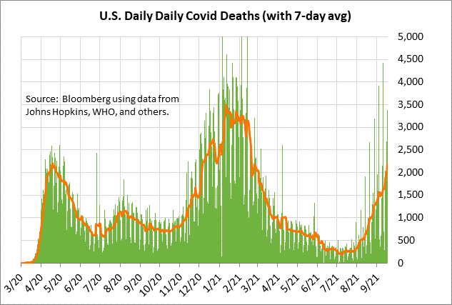 The 7-day average of new U.S. daily Covid infections has been stuck in the high range of about 140,000-170,000 for the past month. Meanwhile, the 7-day average of daily Covid deaths last Friday hit a new 7-month high of 2,230.