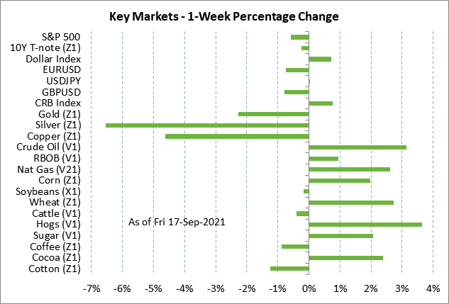 Weekly market focus — The global markets this week will focus on (1) the FOMC meeting on Tuesday/Wednesday and comments by Fed Chair Powell and other Fed officials on Friday at a Fed panel, (2) House consideration of the CR, debt ceiling hike, $550 billion infrastructure bill, and $3.5 trillion reconciliation bill, (3) whether the U.S. Covid infection rate starts to fade, (4) the Evergrande crisis in China as the government tries to prevent contagion from the massive property developer’s expected debt default, and (5) the Treasury’s sale of 20-year bonds and 10-year TIPS.