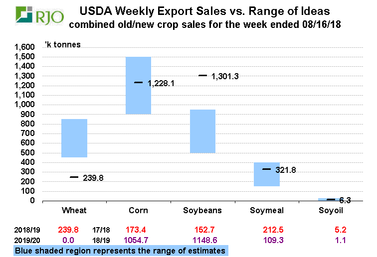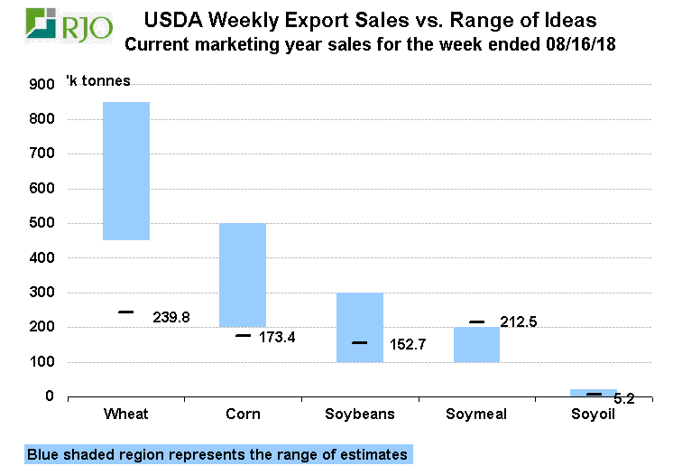 U.S. wheat sales, for the week ended 8/16/18, were a mere 240k tonnes (8.8 million bushels), sharply below market expectations of 450-850k tonnes and were down significantly from the previous week’s 29.5 million, while being the 2nd lowest of the first 11 weeks of the 2018/19 marketing year. Optimism has been building a bit in the market of late for a potential pick-up in U.S. wheat export sales given the multiple global issues this year, but that certainly hasn’t been the case yet as weekly sales have averaged just 14.5 million bushels/week in 2018/19 vs last year’s 16.5 million/week during the same period. Total commitments of 314 million bushels are down 26% from last year’s 424 million at this time, as sales will need to average roughly 17.3 million bushels/week over the entire remainder of the marketing year if the USDA’s 1.025 billion bushel export projection is to be met – a massive 59% stronger than last year’s 10.9 million bushels/week average sales from this point forward.