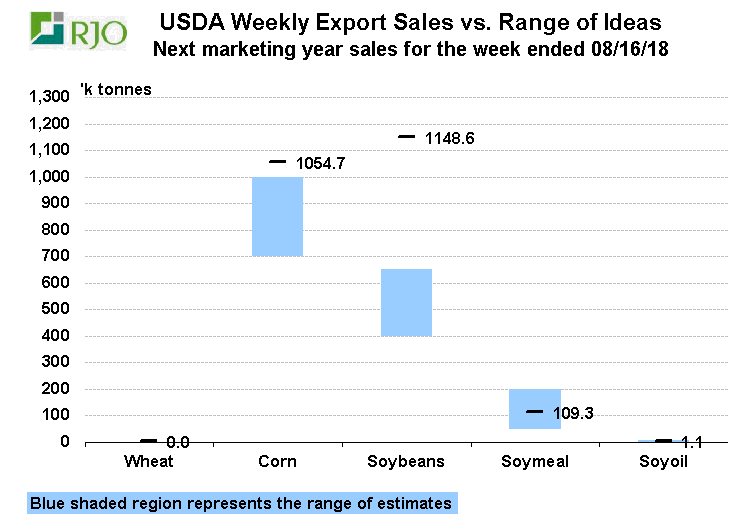 Old crop corn sales were minimal last week at 173k tonnes (200-500k expected), but shouldn’t be all that surprising with only two weeks left in the marketing year. Interestingly, though, there is a sizable 225 million bushels of outstanding corn sales on the books vs 113 million at this time last year and implies the potential for a larger-than-usual amount of old crop sales may be carried through to the new marketing year. Even if 50 million bushels of corn is shipped per week to end the year, as has been the case in recent weeks, carry-over sales to next year could be around 125 million bushels vs last year’s 40 million. New crop sales were solid at 1.055 MMT (41.5 million bushels), slightly above market expectations of 700k-1.0 MMT, and put 2018/19 total commitments at 390 million bushels vs new crop sales at this time last year of 243 million.
